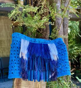 The hukahuka for this piece are made with Foxton harakeke prepared in different ways. The exception is the white muka which is from Ōtaki. I had saved what remained once I completed my first ever hieke. That hieke was for my brother Basil and the colours are of the sea, which was especially appropriate for him. They reflect his many years of involvement in organisations such as surf lifesaving, coast guard and search and rescue